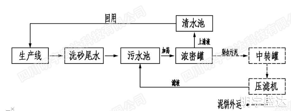 生產(chǎn)加工過(guò)程中需要進(jìn)行洗砂操作以便從原料中分離出成品砂石,期間會(huì )產(chǎn)生洗砂尾水。洗砂尾水的主要污染物指標是懸浮物,懸浮物大量存在形成泥渣水,從而導致水體污染,無(wú)法循環(huán)使用。根據要求,需要對生產(chǎn)廢水進(jìn)行處理,達到環(huán)保要求。項目考慮將處理后的廢水進(jìn)行回用。
